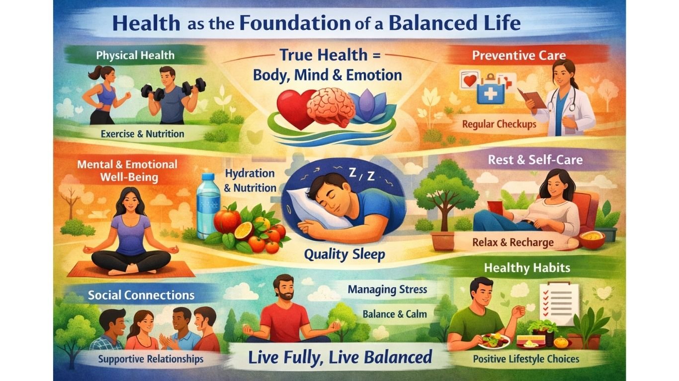 Health is not limited to the absence of illness; it includes physical, mental, and emotional well-being. A healthy person feels energetic, focused, and emotionally stable. Maintaining good health allows individuals to live life fully and handle daily responsibilities more effectively.